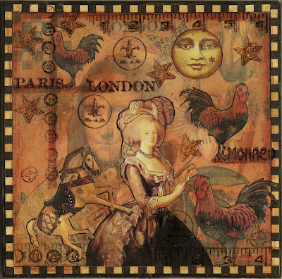 Here a 7,5x7,5 inch collage on mdf (birch) that I made for these challenges :) I gessoed, painted, inked, stamped and collaged my background and used images from: